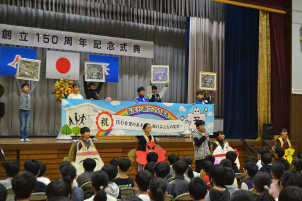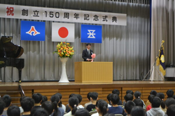 150周年記念式典・講演会に、多くのご来賓に来校していただき、盛大に開催することができました。5・6年生が代表として体育館での式典に参加し、1年生から4年生までは教室でオンライン配信を視聴しました。児童会の代表の言葉では、これまでの150周年の歩みを振り返るともに、引き継がれたバトンをしっかりとつなぐ宣誓を行いました。
