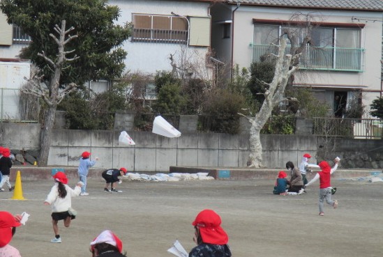 風が強くなる時期に合わせ、1年生は生活科の学習でたこあげをしました。