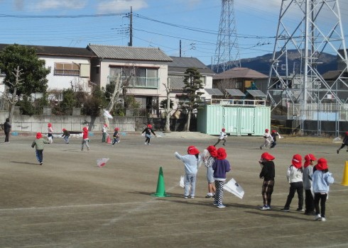 風が強くなる時期に合わせ、1年生は生活科の学習でたこあげをしました。